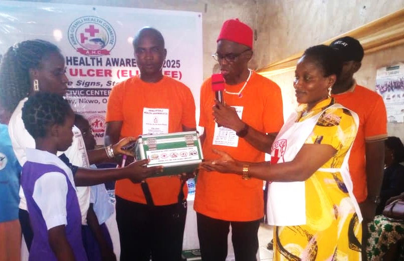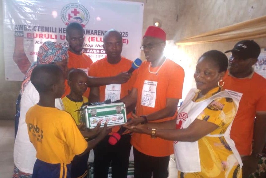 The Awba-Ofemili Development Union (ADU), through its Health Committee, has donated First Aid boxes to seven schools in Awba-Ofemili, Awka North Local Government Area of Anambra State, as part of its 2025 Community Health Awareness Campaign themed “Buruli Ulcer (Elu-Ulee): Know the Signs, Stop the Spread.”