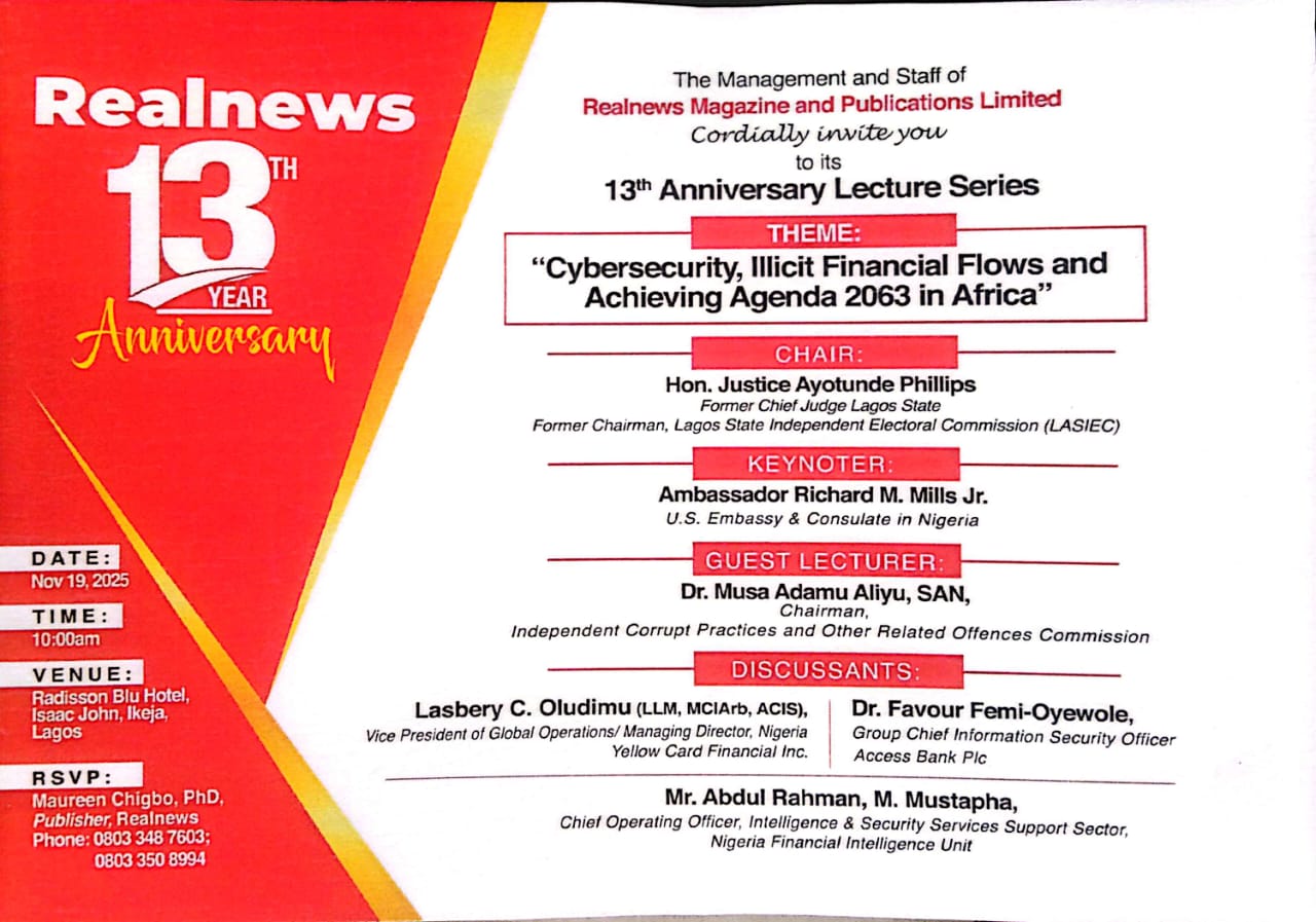 The Management of Realnews Magazine and Publications Limited, publishers of Realnews Magazine Online, has announced that three top fintech and security experts will feature at the high-level panel discussion at the Realnews 13th Anniversary Lecture Series.